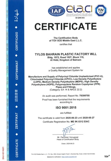 "في مصانع تايلوس للبلاستيك نلتزم بأعلى معايير الجودة، وقد حازت منتجاتنا على اعتمادات دولية مرموقة مثل ISO وSASO، تأكيدًا لثقة عملائنا في كل ما نقدمه."